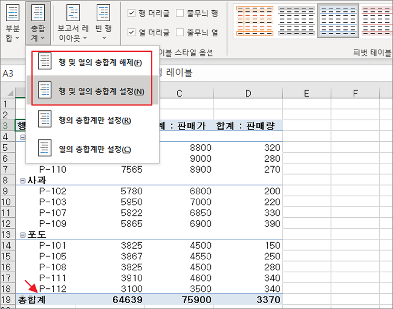 ▼ “총합계” 리본 메뉴는 행과 열의 값들에 대한 전체 합계값을 표시할 것인지 정할 수 있습니다.