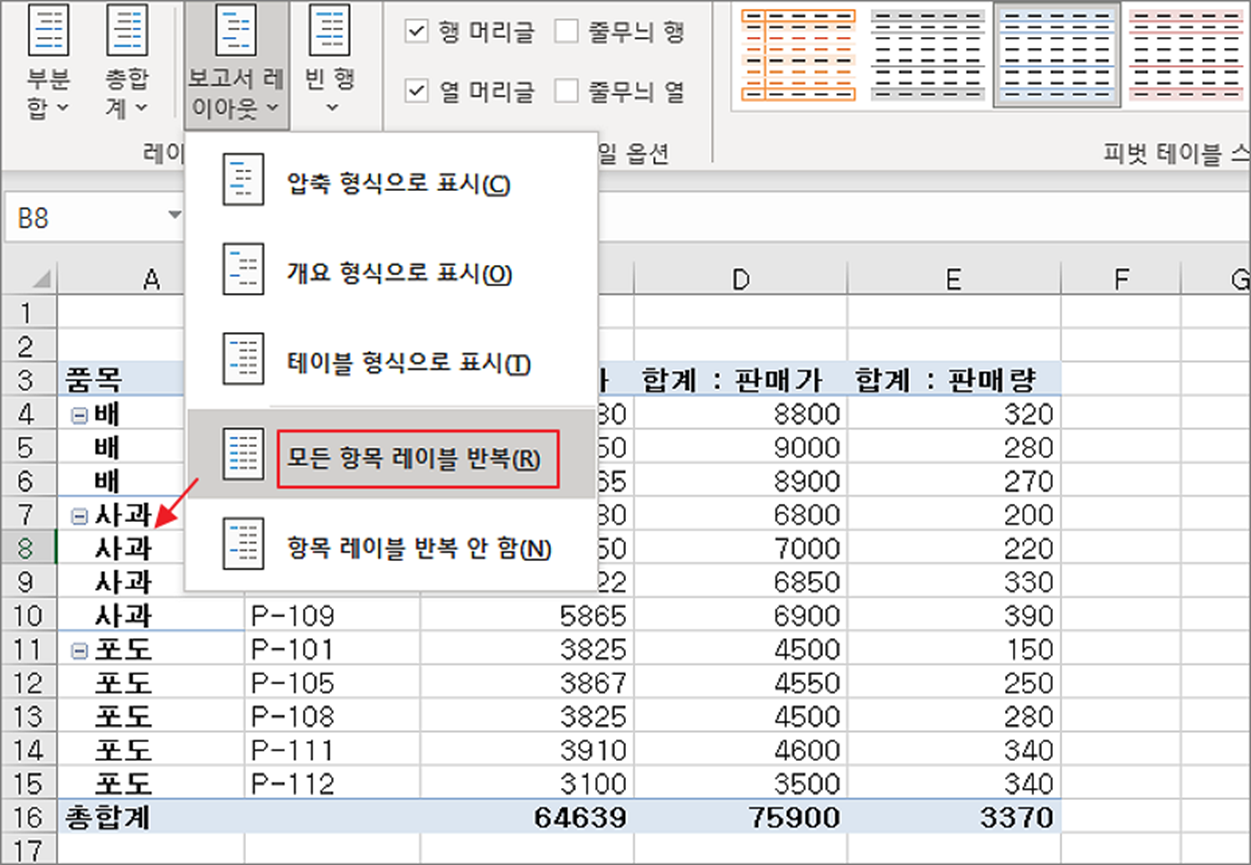 ▼ 보고서 레이아웃에서 “모든 항목 레이블 반복” 은 생략된 동일한 값들을 모두 표시합니다.