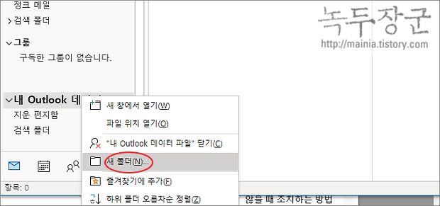 ▼ 기존 계정에서 백업할 메일들을 이곳으로 옮기기 위해 새로운 보관함을 하나 만들겠습니다. 오른쪽 마우스 > 새 폴더 메뉴를 선택합니다.
