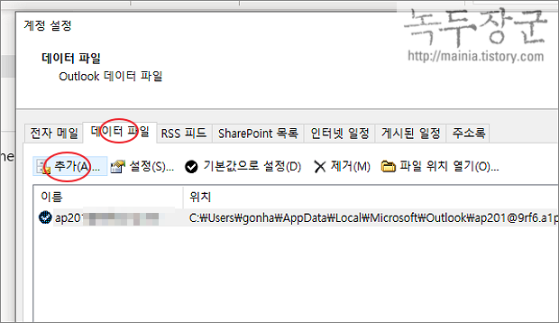 ▼ 계정 설정 팝업창에서 데이터 파일 탭 > 추가 버튼을 클릭합니다. 새로운 아웃룩 메일 보관 파일을 만들어 보겠습니다.