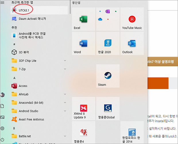 ▼ 프로그램 실행을 위해 시작메뉴로 가시면 UTCk 3.1 폴더를 볼 수 있습니다. 메뉴를 클릭해서 프로그램을 띄웁니다.