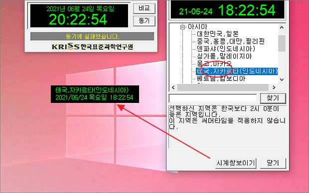 ▼ 목록에서 지역을 선택하고 [시계창보이기] 버튼을 클릭하면 바탕화면에 시계가 하나씩 나타납니다. 여러 개를 추가해서 바탕화면의 원하는 위치에 옮겨 둘 수 있습니다. 여행을 하고 있다면 해당 지역에 시계를 세팅하는 것도 좋겠죠.