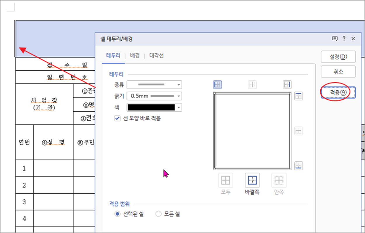 ▼ 이번에는 셀의 각 라인에 선 종류를 변경하는 방법입니다. 셀을 선택하고 “셀 테두리/배경” 화면을 띄웁니다. 테두리 설정 영역으로 가서 변경하고 싶은 방향의 라인 아이콘을 클릭해서 선택합니다. 해당 라인에 적용하고 싶은 라인 종류와 굵기, 색을 변경하고 오른쪽으로 가서 “적용” 버튼을 클릭합니다.