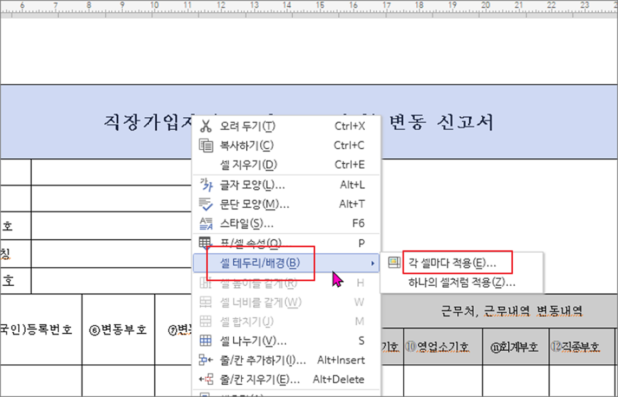 ▼ 다음은 셀을 선택한 상태에서 L 키 를 누르거나 오른쪽 마우스 > 셀 테두리 배경 > 각 셀마다 적용 메뉴를 클릭합니다.