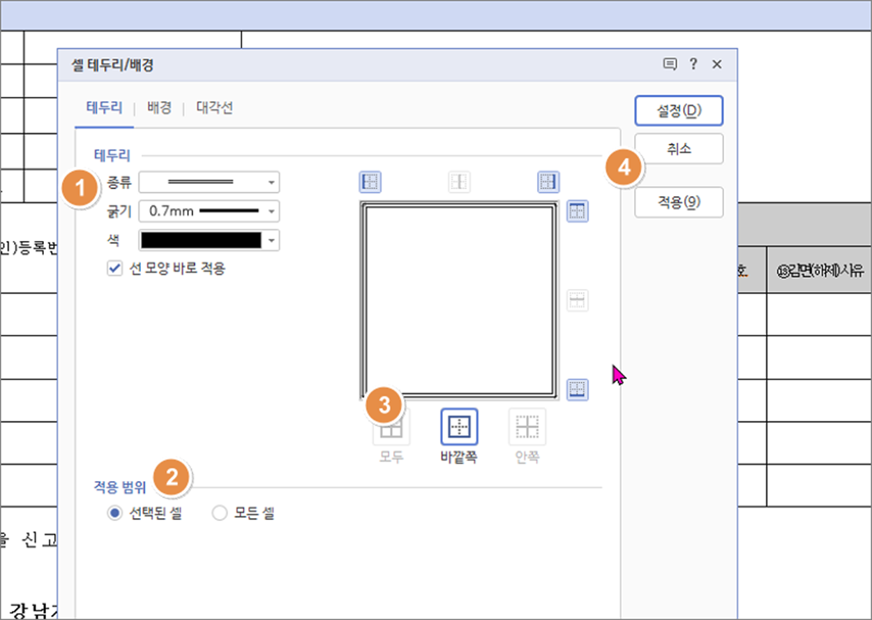 ▼ 테두리 설정 영역은 크게 4가지로 나눌 수 있습니다. 첫 번째 1번에서는 선의 종류와 굵기 색상을 지정합니다. 2번은 현재 선택한 셀만 적용할 것인지 아니면 표 전체에 모두 적용할 것인지 선택할 수 있는 옵션입니다. 3번은 셀의 모든 선의 속성을 변경할 수 있는 옵션 영역입니다. 4번은 변경한 설정을 적용하거나 취소할 때 사용하는 버튼입니다.