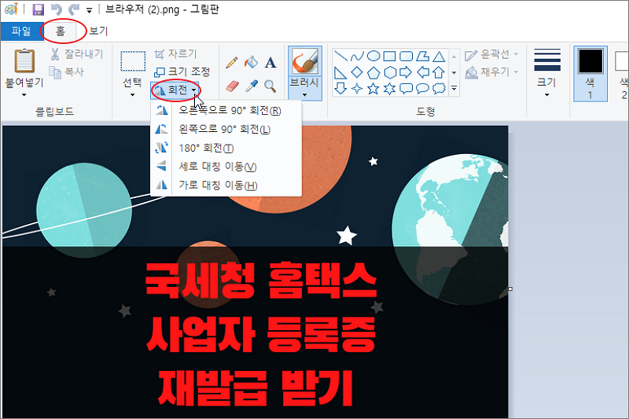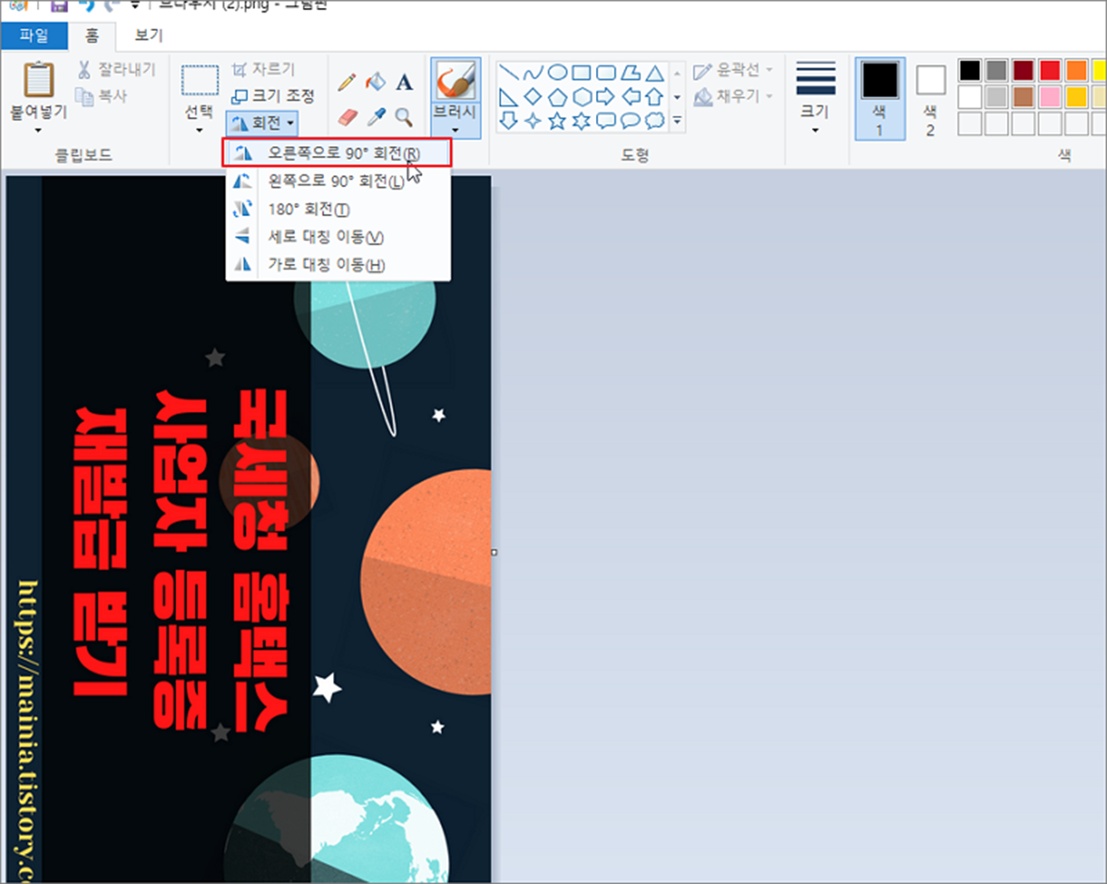 ▼ 회전도 간단합니다. 좌우로 90도 간격 회전이 가능합니다. 가로로 사진을 찍었는데 가로로 서 있는 경우 그림판을 이용해서 간단하게 수정이 가능하겠죠. 단 회전하고 이미지를 저장해야 원하는 결과의 사진이 됩니다.