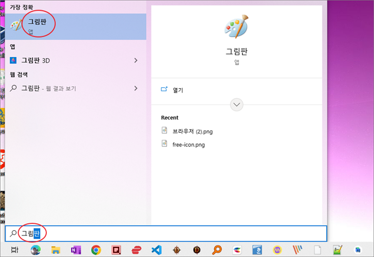 ▼ 윈도우에 기본으로 내장되어 있는 그림판을 좀더 빠르게 실행하기 위해서 시작메뉴를 이용합니다. 실행창의 검색어로 “그림판” 을 입력해서 바로 앱을 찾습니다.