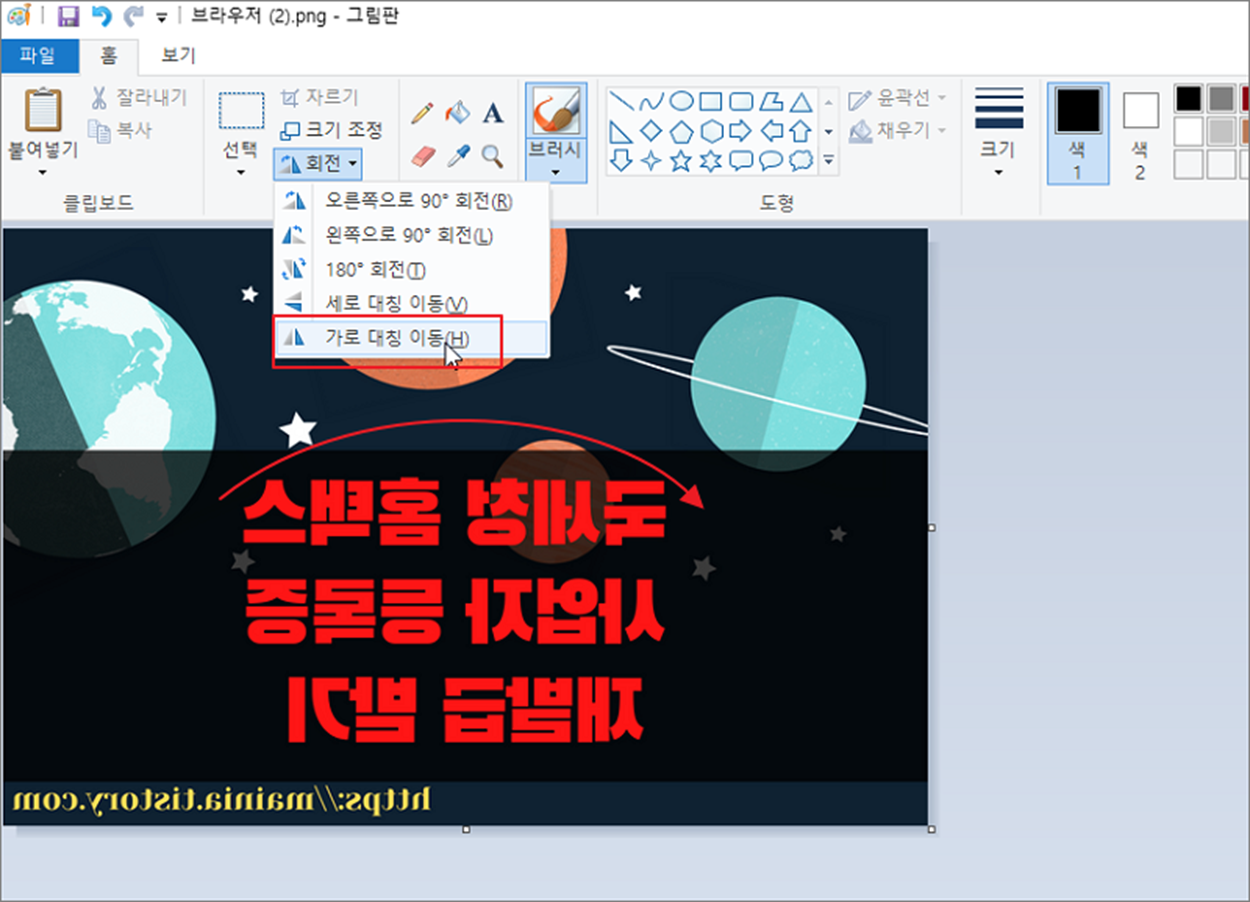 ▼ 다음은 가로 대칭 이동을 클릭해 봅니다. 좌우로 이미지 반전이 일어났습니다. 이미지를 앞뒤로 뒤집은 결과입니다.