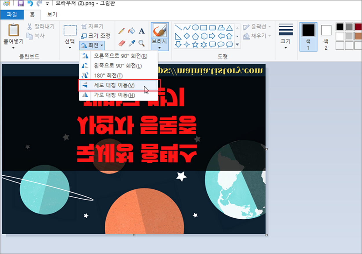 ▼ 회전 메뉴 하위에 세로 대칭 이동 메뉴를 클릭합니다. 결과는 위 아래 반전된 이미지가 되었습니다.
