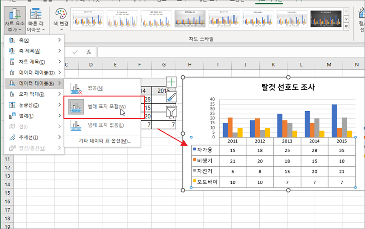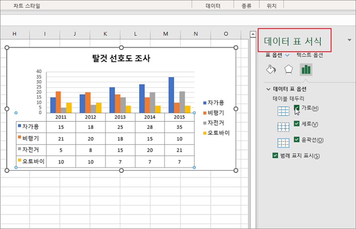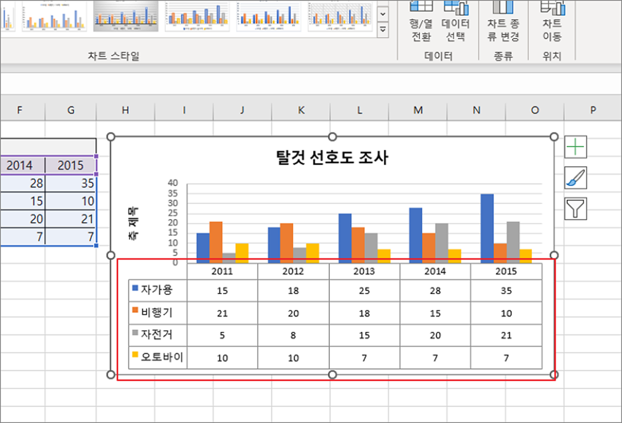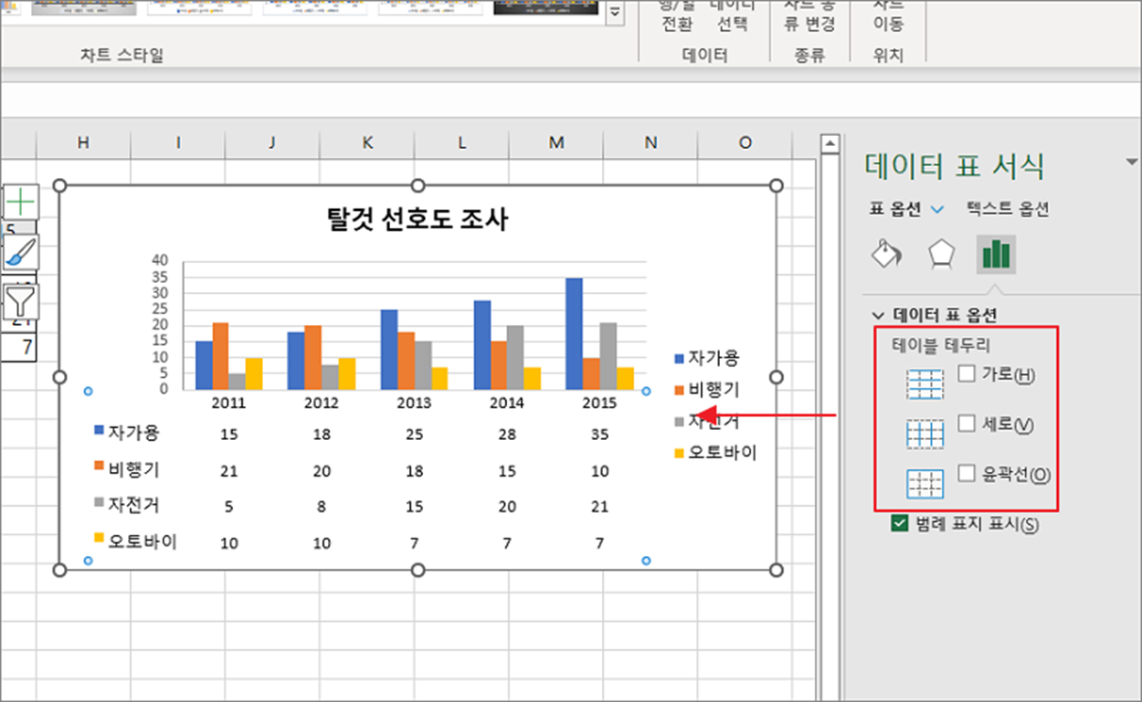 차트에 사용된 데이터는 차트 틀 내에 표시할 수 있습니다. 보통 차트와 데이터는 분리하는데 좀더 디테일한 분석이 필요할 때 데이터를 차트 바로 옆에 표시하곤 합니다. 하지만 데이터가 많은 경우 차트 모양이 줄기 때문에 비효율적일 수 있습니다.