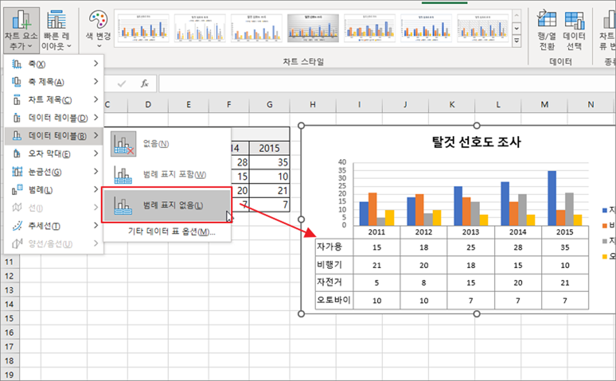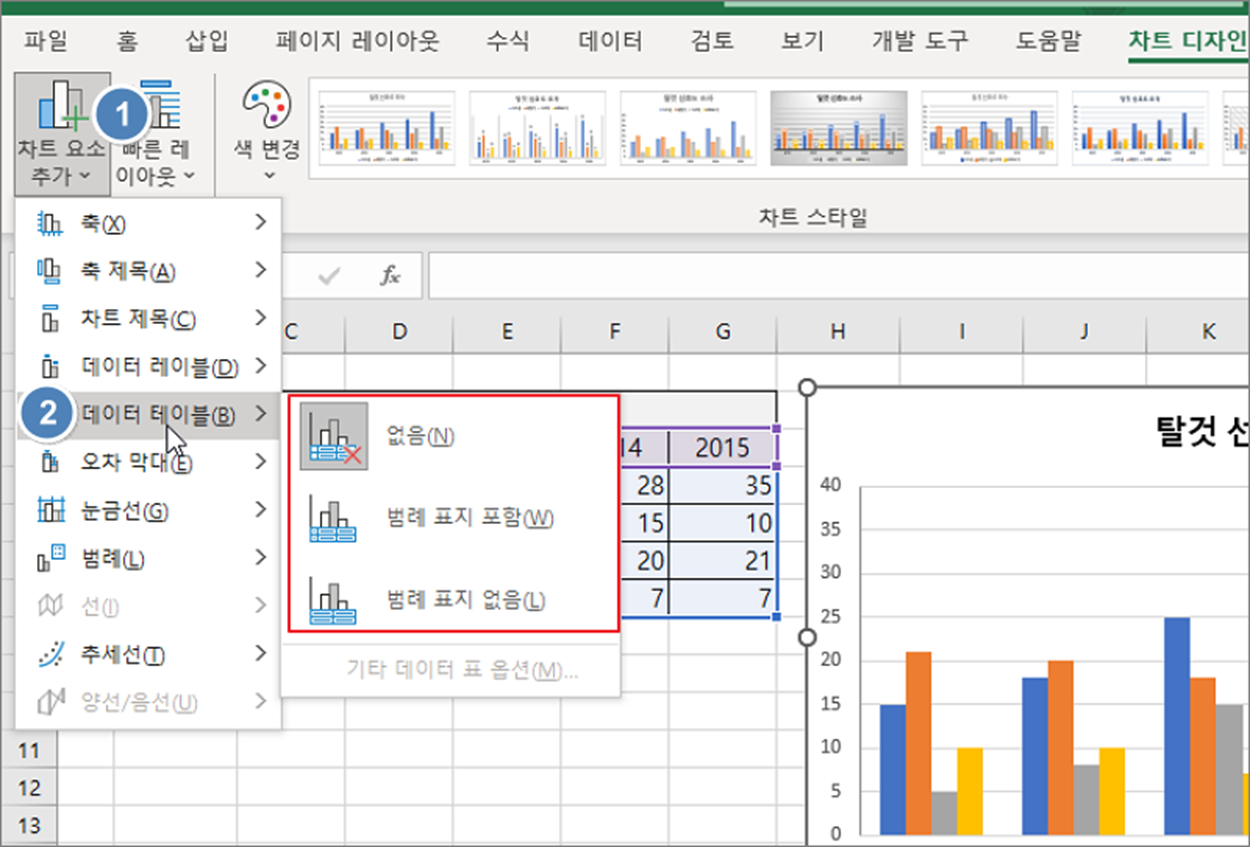 ▼ 두 번째로 차트 요소 추가 리본 메뉴에서 데이터를 표시하는 방법입니다. 차트 디자인 > 차트 요소 추가 > 데이터 테이블 메뉴를 차례대로 선택해 보세요. 하위에는 3가지 종류의 데이터 테이블 표시 방법이 주어집니다. 기본인 없음은 데이터 테이블을 표시하고 싶지 않을 때 선택합니다.