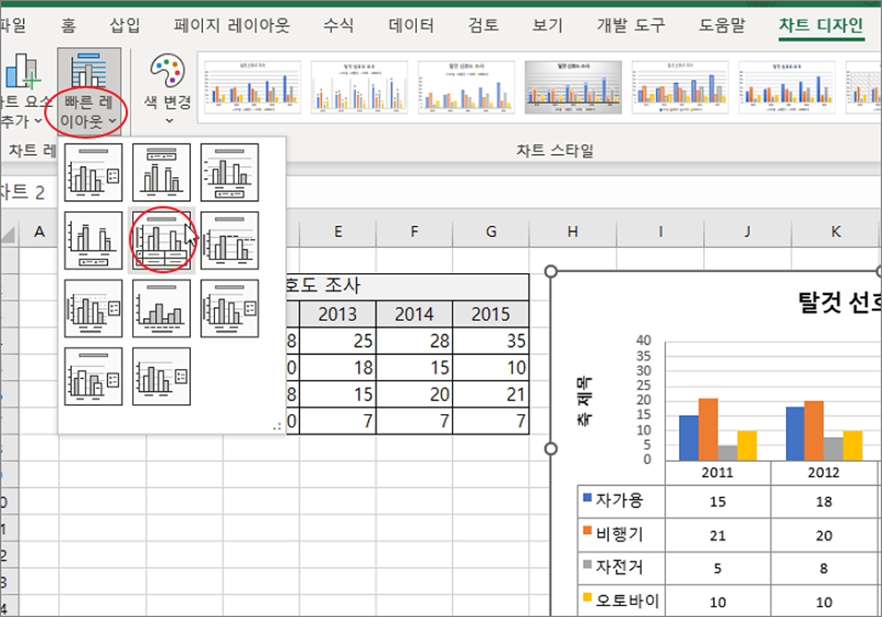 ▼ 다음 차트 디자인 탭 왼쪽 끝에 빠른 레이아웃 리본 메뉴를 클릭합니다. 메뉴 아래에는 적용 가능한 다양한 레이아웃들이 목록으로 나타납니다. 그 중에서 데이터를 차트 하단에 표시하고 있는 이미지를 선택합니다.