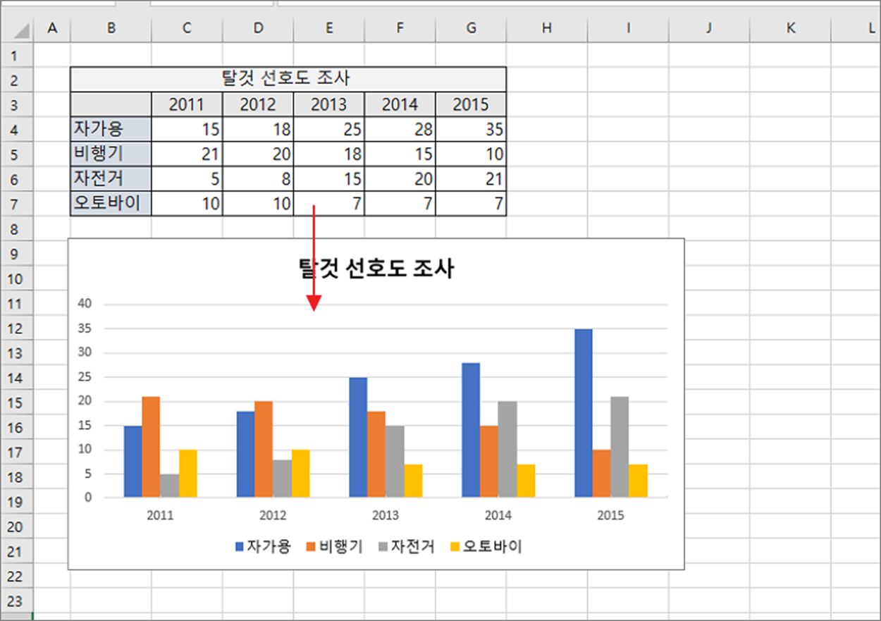 ▼ 결과는 다음과 같습니다. 차트에 사용한 데이터를 바로 아래에 표 형태로 표시했습니다.