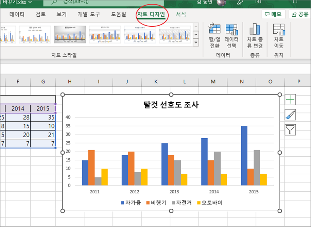 ▼ 차트에 사용한 데이터를 그래프 바로 아래에 표시하는 방법으로 빠른 레이아웃 리본 메뉴를 이용합니다. 먼저 차트 > 상단 차트 디자인 탭을 선택합니다.