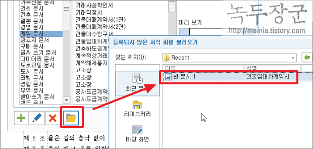 ▼ 이렇게 저장한 서식파일은 문서마당의 [등록하지 않은 서식 불러오기] 버튼으로 화면에 추가할수 있습니다. 이렇게 여러사람들이 모여서 문서 작업을 하는 곳이라면 문서 표준을 hwt 로 만들어 배포해서 관리하시면 편하겠죠. 나중에 취합할때 표준 맞춘다고 고생하지 않아도 되잖아요.