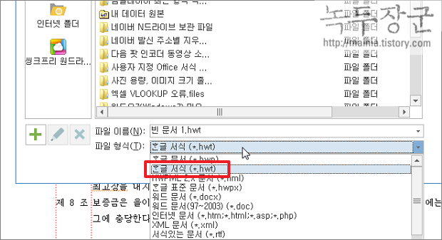 ▼ 만약 문서마당에서 불러온 내용이나 자신이 작성한 것이 다음에 자주 사용할 서식이라면 확장자가 hwt 인 서식파일로 저장합니다.