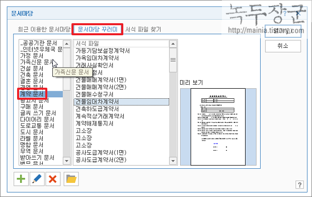 ▼ 문서마당 대화상자를 열어서 [문서마당 꾸러미] 탭을 클릭합니다. 그속에는 종류별로 많은 문서들을 추가해 놓았습니다. 자기한테 적합한 문서가 없더라도 비슷한 내용을 고쳐서 사용하시면 됩니다.