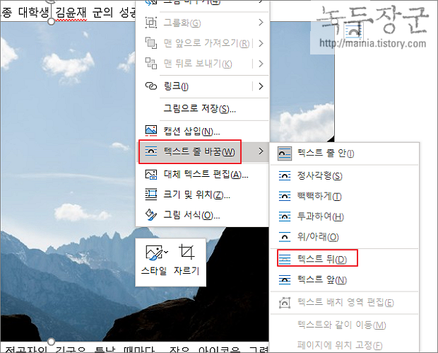 ▼ 이미지를 편집 화면에 추가하고 개체를 선택한 후 오른쪽 마우스를 누릅니다. 화면에 빠른 실행 메뉴가 뜨면 텍스트 줄 바꿈 > 텍스트 뒤 메뉴를 선택합니다. 해당 메뉴는 이미지위에 글을 배치합니다.