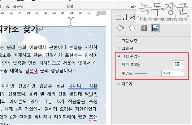 ▼ 왼쪽 사이드에 나타난 그림 서식 옵션 화면에서 그림 투명도 설정값을 사용자가 원하는 만큼 조절합니다.