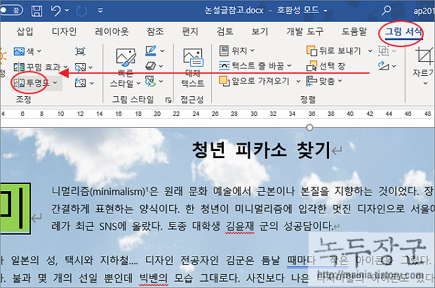 ▼ 이미지 개체를 선택하면 상단에 그림 서식 탭이 나타납니다. 그림 서식에는 다양한 이미지 편집 기능이 있습니다. 투명도를 높이기 위해 그림 서식 > 조정 > 투명도 리본 메뉴를 클릭합니다.
