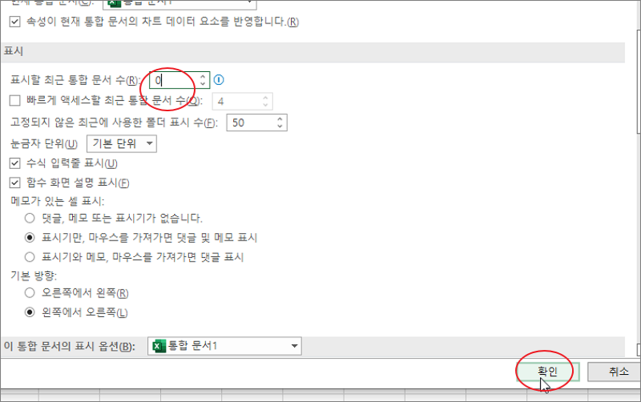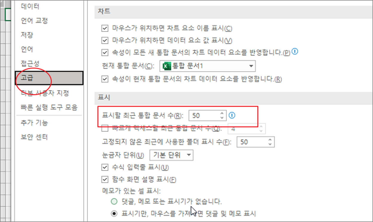 ▼ 왼쪽 사이드에 고급 메뉴를 선택하고 오른쪽으로 가서 표시 항목을 찾습니다. 그리고 “표시할 최근 통합 문서 수” 의 값을 변경합니다.