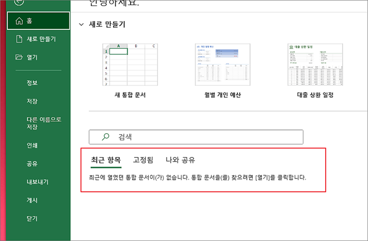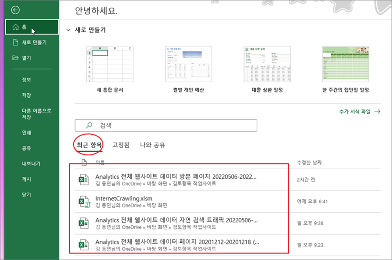 ▼ 홈 화면으로 가면 최근 항목 탭에 지금까지 사용한 문서를 최근 순으로 정렬해서 보여줍니다. 목록이 화면에 나타나지 않도록 설정을 변경해 보겠습니다.