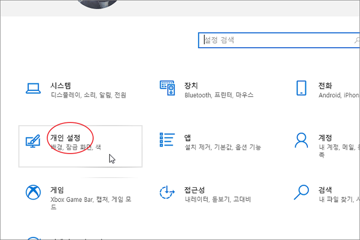 ▼ 설정을 변경하기 위해 윈도우10 설정 > 개인 설정 메뉴를 클릭합니다.