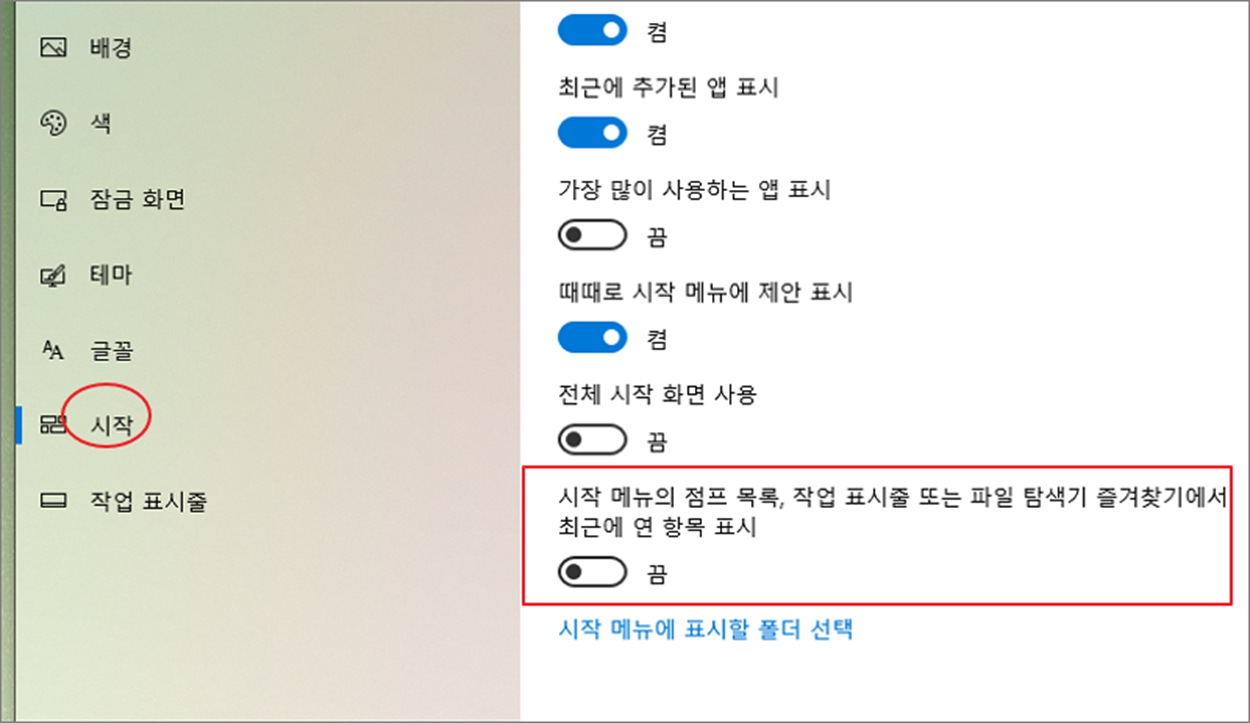 ▼ 시작 메뉴 화면에서 “시작 메뉴의 점프 목록, 작업 표시줄 또는 파일 탐색기 즐겨찾기에서 최근에 연 항목 표시” 를 끔으로 변경합니다.