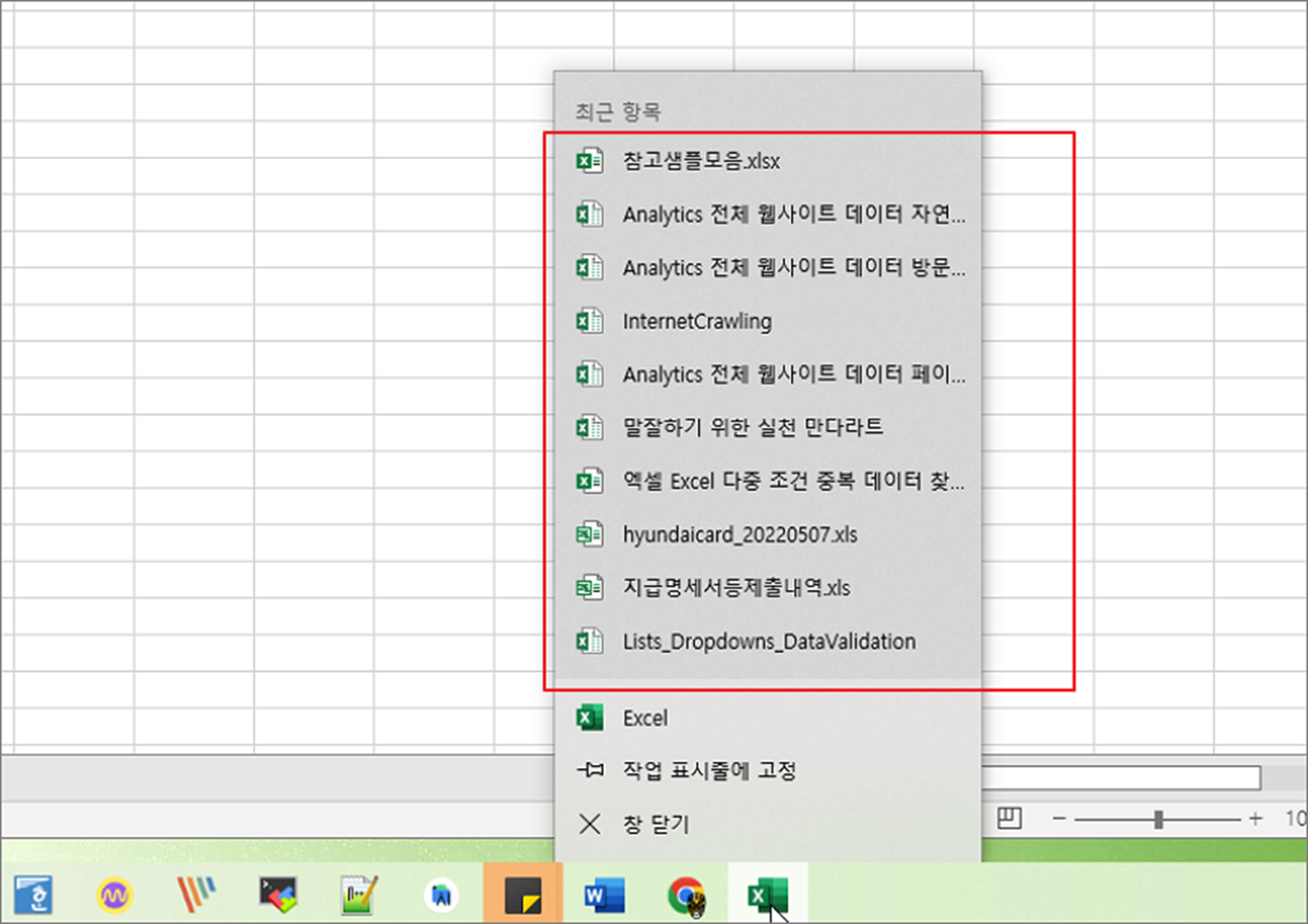 엑셀은 문서를 시작할 때 표시하는 “최근 항목” 에 최근 사용했던 문서 목록을 보여줍니다. 해당 기능은 이전에 사용했던 문서를 빠르게 실행할 수 있어서 아주 유용합니다. 하지만 여러 사람이 사용하는 컴퓨터나 개인 PC 에서 정보 노출을 꺼린다면 문서 사용 이력이 나타나지 않도록 지우는 것이 좋습니다. 엑셀과 작업 표시줄에 나타나는 문서 사용 이력이 나타나지 않도록 설정을 변경하는 방법에 대해 알아봅니다.