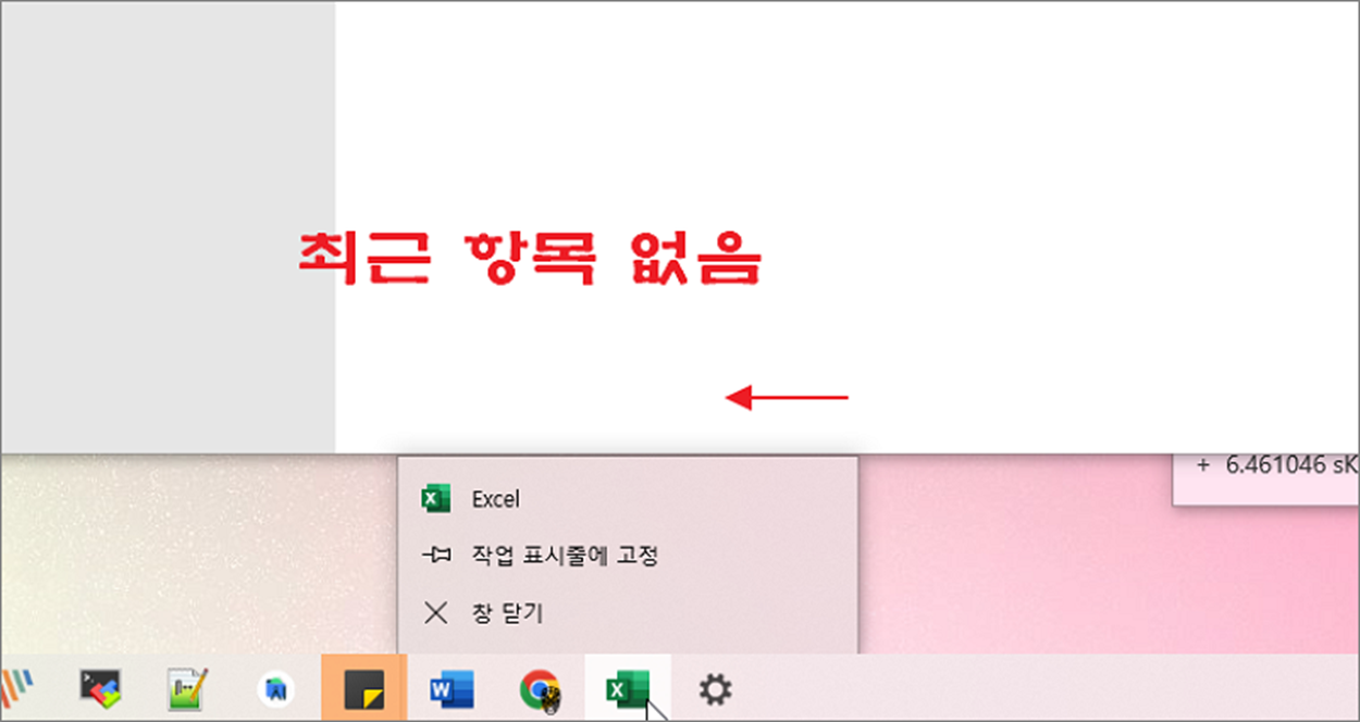 ▼ 설정 변경이 제대로 적용되었는지 확인하기 위해 작업 표시줄의 엑셀 아이콘으로 갑니다. 그리고 오른쪽 마우스를 눌러 보세요. 최근 항목이 없는 것을 확인할 수 있습니다.