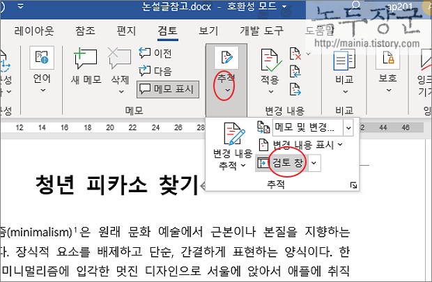 ▼ 문서의 내용이 길고 메모가 여러 곳에 흩어져 있다면 찾아서 편집하기기 쉽지 않습니다. 워드에서는 메모만 모아서 편집할 수 있도록 메모 "검토 창" 을 제공하고 있습니다. 검토 탭 > 추적 > 검토 창 리본 메뉴를 클릭합니다.