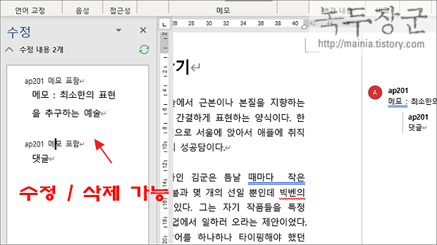 ▼ 왼쪽 사이드에 나타난 검토 창에서 문서의 모든 메모를 볼 수 있습니다. 해당 메모의 수정과 삭제가 가능하며 선택하는 순간 페이지에 메모 위치로 이동합니다. 메모 편집할 때 아주 유용한 기능입니다.