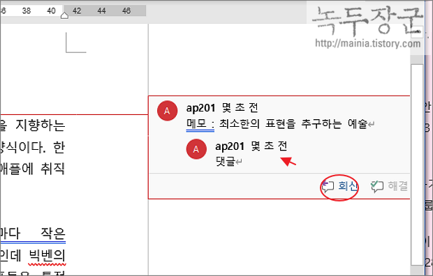 ▼ 메모는 다른 사람과 문서 공유할 때 소통의 도구로 사용하기도 합니다. 상대방이 써 놓은 메모에 회신 버튼을 눌러 댓글을 달아 답을 할 수도 있습니다.