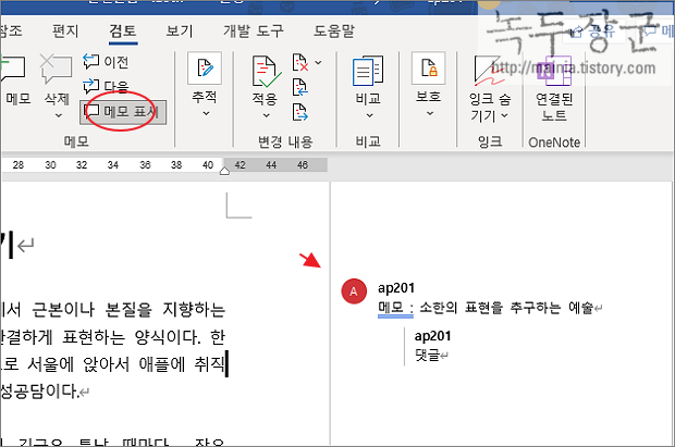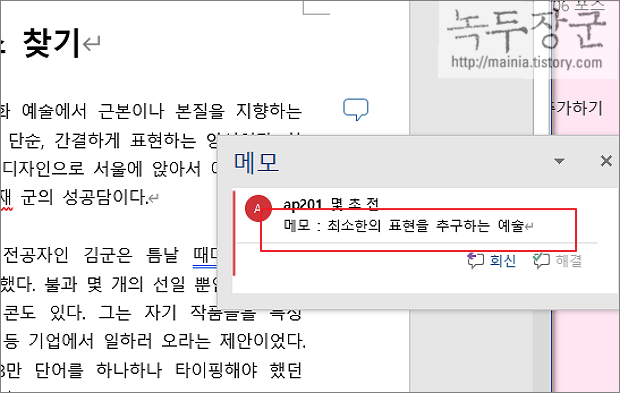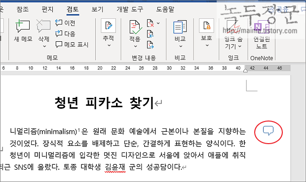 워드에서 메모는 엑셀과 달리 글 바로 위에 표시되는 것이 아니라 문서 오른쪽 여백에 나타납니다. 메모는 문서의 단어나 문장에 설명이 필요할 때 주로 쓰는 기능입니다. 또한 공동 작업하는 문서에서 소통의 도구로도 사용합니다.