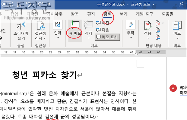 | ※ 아래는 참고하면 좋을 만한 글들의 링크를 모아둔 것입니다. ※ ▶ MS 워드 추가한 메모 인쇄 할 때 제외하는 방법 ▶ MS 워드 메모 삽입, 삭제, 단축키 이용하기 ▶ MS 워드 화면 설명 표시 및 숨기기, 툴팁 화면 숨기기 ▶ MS 워드 텍스트 읽어주기 TTS 기능 활용하기 ▶ MS 워드 대표 단축키 정리 |