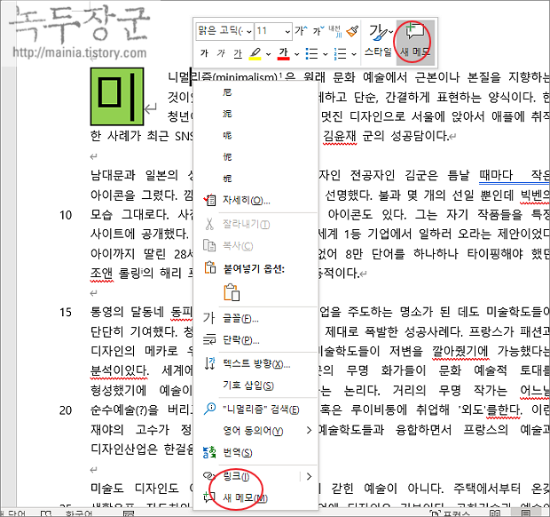 ▼ 추가하고 싶은 단어나 문장을 선택하거나 커서를 둡니다. 오른쪽 마우스를 눌러 빠른 실행 메뉴에서 새 메모 버튼을 눌러 추가할 수 있습니다. 메모 추가 단축키는 Ctrl + Alt + M 입니다.