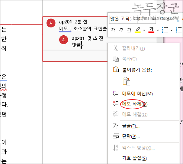 ▼ 메모를 삭제하는 방법은 간단합니다. 메모가 있는 위치에서 오른쪽 마우스를 눌러 메모 삭제 메뉴를 선택합니다.