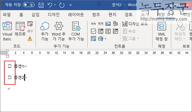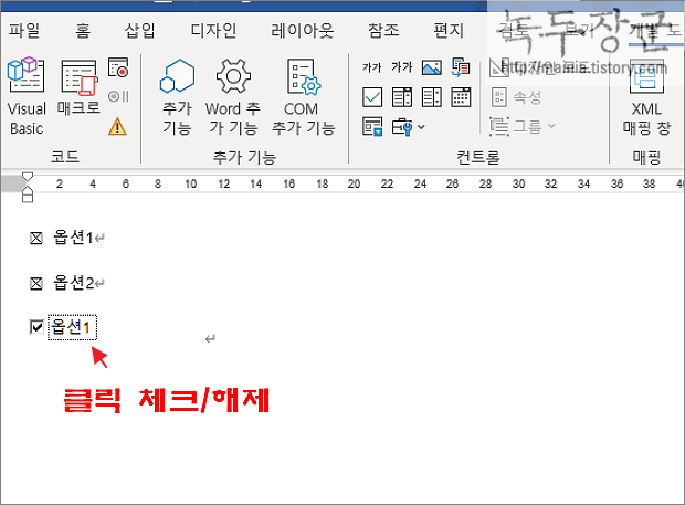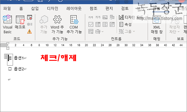 ▼ 그림처럼 워드 화면에 체크 박스를 추가했습니다. 타이틀은 체크 박스 옆에 문자로 입력합니다.