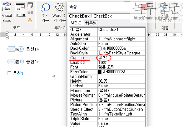 ▼ 속성 창에서 CheckBox 의 타이틀은 Caption 항목입니다. 텍스트를 수정해서 CheckBox 의 타이틀을 원하는 이름으로 변경합니다.