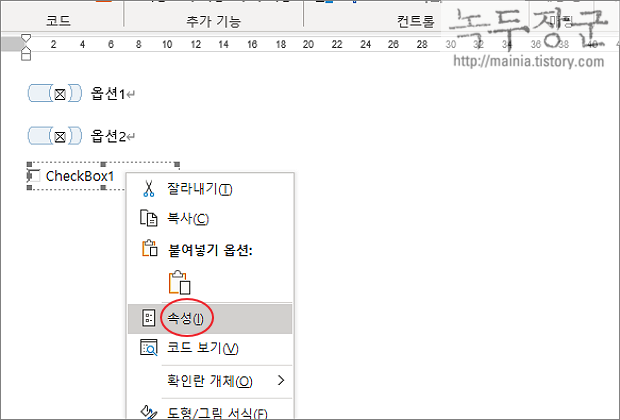 ▼ 체크 박스를 선택하고 오른쪽 마우스 > 속성 메뉴를 클릭합니다.