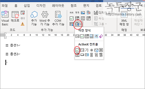 워드에서도 일반 프로그램처럼 체크 박스의 컨트롤을 문서에 표시할 수 있습니다. 특수문자가 아닌 체크 표시를 하고 해제할 수 있는 컨트롤 객체입니다. 종류는 두 가지가 있습니다. 일반 컨트롤과 ActiveX 형태의 컨트롤 두 가지 종류를 제공합니다.