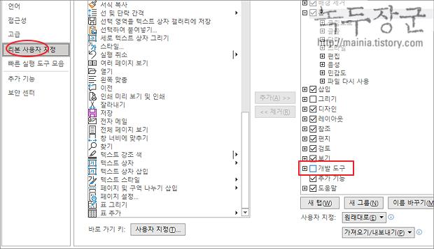 ▼ 옵션창의 왼쪽메뉴 "리본 사용자 지정" 을 선택합니다. 오른쪽 화면으로 이동해서 현재 관리하고 있는 리본 메뉴 목록으로 갑니다. 개발 도구 항목을 찾아 체크합니다.