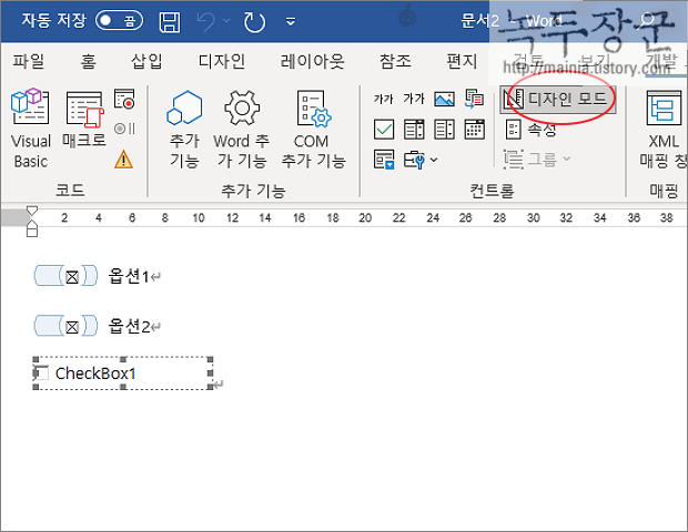 ▼ 화면에 추가한 CheckBox 컨트롤 정보를 수정하기 위해서는 디자인 모드를 활성화해야 합니다. 그림처럼 디자인 모드 메뉴가 눌러져 있어야 합니다. 그래야 컨트롤 박스와 함께 들어가 있는 "CheckBox1" 타이틀을 수정할 수 있습니다.