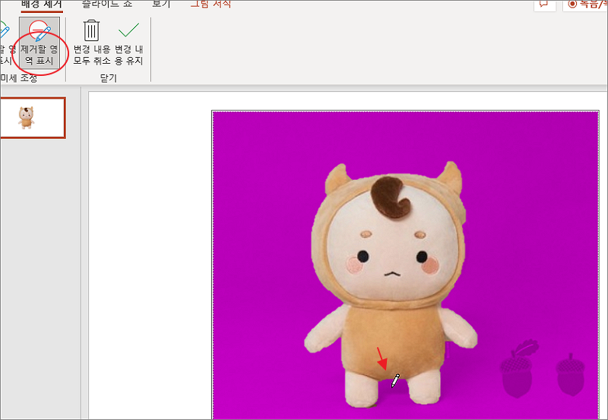 ▼ 다음은 아직 남아있는 불필요한 배경을 삭제하는 방법입니다. “제거할 영역 표시” 리본 메뉴를 클릭해서 기능을 활성화합니다. 그리고 펜으로 삭제하고 싶은 영역을 클릭합니다. 파워포인트는 클릭한 지점의 색상과 이미지의 경계를 계산해서 삭제할 영역으로 변경합니다.