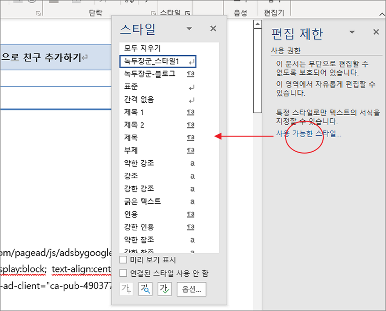 ▼ 그런데 기존에 만들어져 있는 스타일 적용은 가능합니다. 편집 제한 창에 “사용 가능한 스타일” 링크를 클릭해서 스타일 선택 창을 띄웁니다. 목록에서 원하는 스타일을 선택하면 문서에 적용할 수 있습니다.