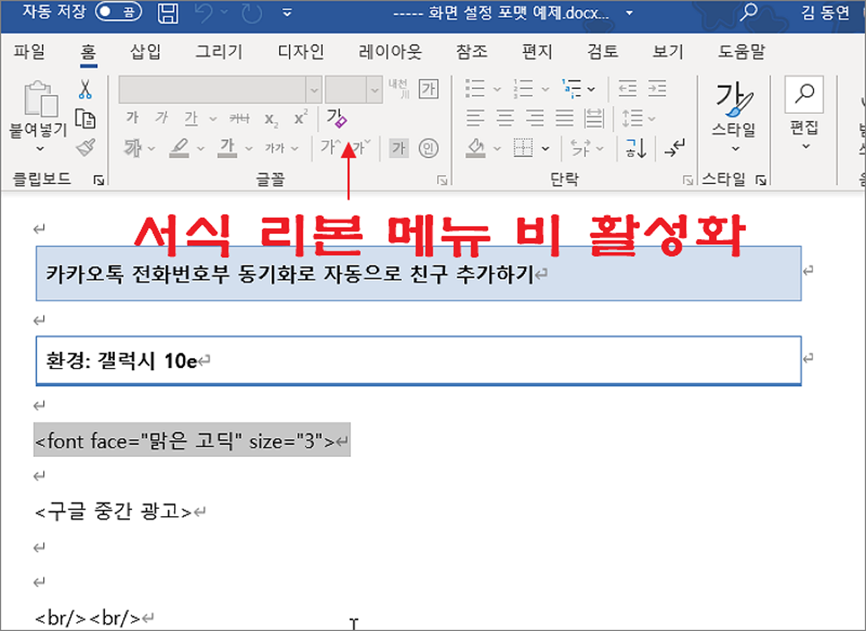 ▼ 적용 결과를 확인해 보겠습니다. 홈 탭으로 가서 서식 관련 리본 메뉴들을 보세요. 클릭할 수 없도록 비활성화가 된 것을 알 수 있습니다.