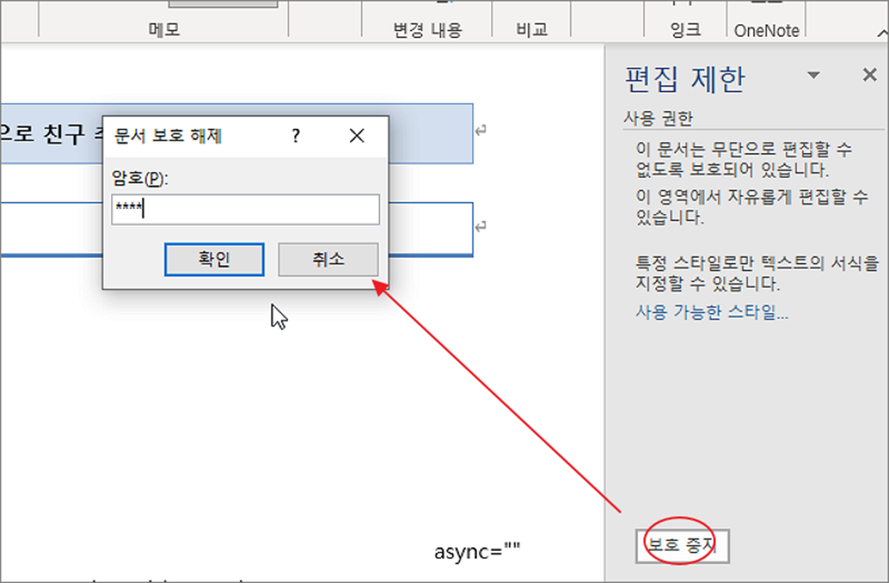 ▼ 편집 제한 창에서 아래로 내려가면 보호 중지 버튼이 있습니다. 문서 보호 해제 창이 뜨면 이전에 입력했던 비밀번호를 입력합니다.