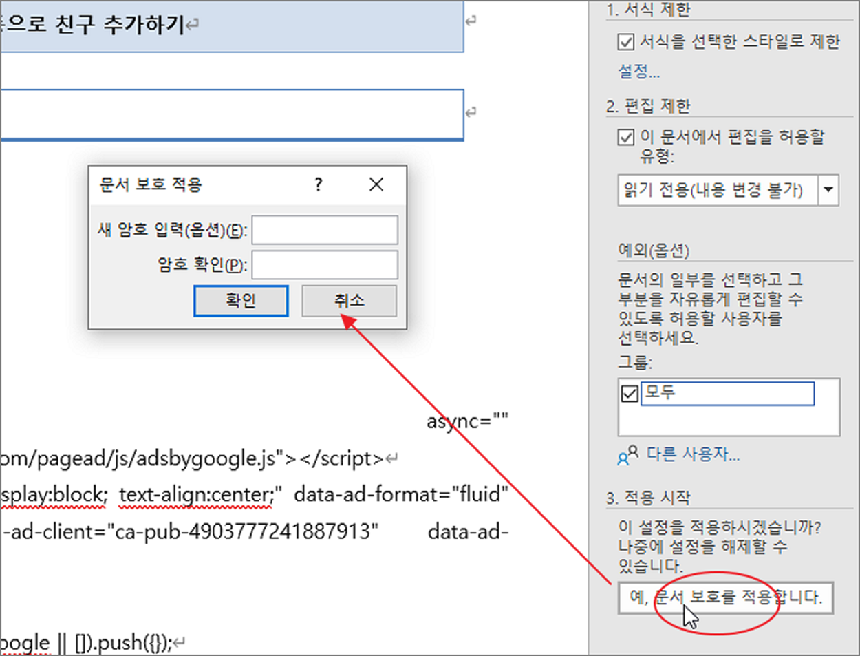 ▼ 바로 아래 예외 조건에서 일부 영역을 지정한 사용자에게 편집할 수 있도록 설정할 수도 있습니다. 옵션 선택이 끝났다면 “예 문서 보호를 적용합니다.” 버튼을 누르고 암호를 입력합니다.