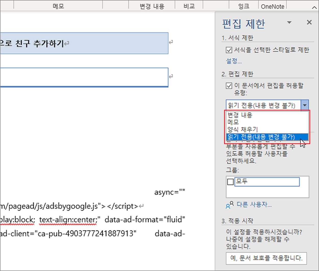 ▼ 다음은 문서 내용을 제한하는 옵션입니다. “편집 제한” 옵션을 체크하고 아래 어떤 항목을 제한할 것인지 선택합니다. 보통 내용 전체를 제한한다면 “읽기 전용(내용 변경 불가)” 를 선택하겠죠.