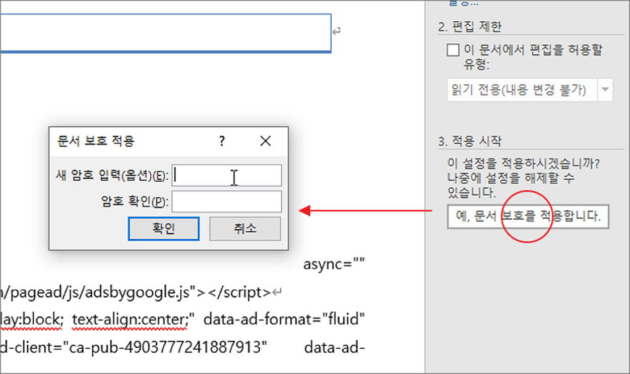 ▼ 아래로 내려와서 “3.적용 시작” 에 있는 “예, 문서 보호를 적용합니다” 버튼을 클릭합니다. 화면에 뜬 문서 보호 적용 창에 암호를 입력합니다.